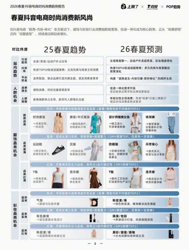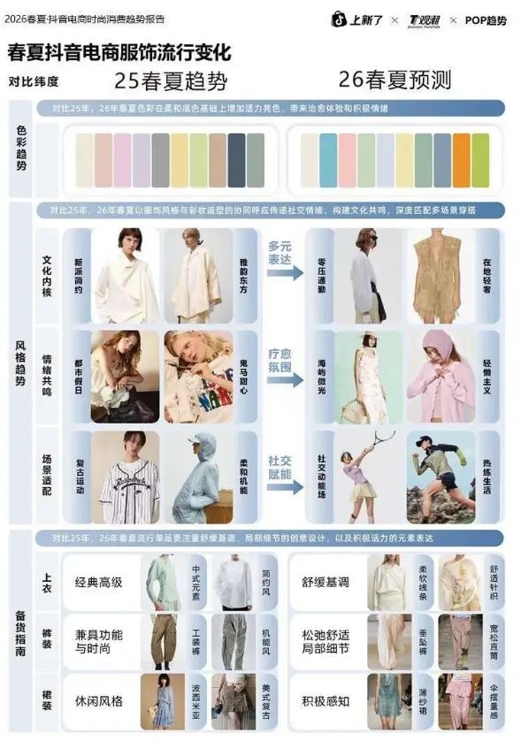 在消费升级与数字经济深度融合的背景下,时尚消费市场正经历上述深刻变革。故此,POP趋势与抖音电商联合共同发布《2026 春夏抖音电商时尚消费趋势报告》,全面解析服饰、彩妆等核心品类的发展态势,揭示 “妆造一体” 成为行业核心增长引擎的市场新逻辑。 报告显示,在 “趋势—内容—转化” 生态驱动下,时尚消费已从单一的 “场景穿搭” 迈向 “完整造型” 的全链路体验,多元风格、场景适配与情绪价值成为驱动消费决策的关键因子。 得益于国家促消费政策持续发力与居民可支配收入稳步提升,时尚消费市场活力持续释放。2025 年前三季度,全国居民人均可支配收入同比增长 5.1%,社会消费品零售总额同比增长 4.0%,其中服装、鞋帽、针纺织品类零售额连续 11 个月保持正增长,化妆品类零售总额突破 4285 亿元,增速高于消费品市场整体水平。 线上渠道成为时尚消费增长的核心引擎。2024 年化妆品线上销售占比已达 52.4%,MAT2025 期间服饰鞋帽商品网上零售额持续攀升,抖音电商凭借独特的内容生态优势,已成长为时尚消费领域头部线上渠道。平台构建的 “看—搜—买—晒” 消费闭环成效显著,72% 的用户认可短视频、直播等内容形态能更直观全面地了解商品,57% 的用户认可平台价格与优惠力度,42% 的用户会被平台时尚主题活动与 IP 挑战吸引,形成了从心智种草到消费转化的完整链路。 关键节点营销与趋势发布成为拉动增长的重要抓手。抖音电商深耕春秋上新与情人节、七夕等礼赠节点,2025 年春上新期间,“欧若风” 趋势发布引发全网热潮,首发新品达 130 万件,日均新品 GMV 同比增长 151%,相关话题跨平台破圈曝光 2.5 亿 +。通过 “上新了!在抖音,头排看秀” 等创新形式,品牌将秀场搬至直播间,实现了内容引爆与销售转化的双重突破,部分品牌大秀直播 GMV 同比增长超 458%。 抖音电商多元内容生态正驱动用户消费需求从单一品类购买向 “妆造一体” 跨品类消费升级。报告显示,同时购买彩妆与服饰的跨品类消费规模已连续两年显著增长,复合增长率达 32%,其中消费人数与消费单价的复合增长率分别为 17% 和 13%。25-35 岁女性为核心消费群体,占比达 88%,18-24 岁年轻人群增速显著,中高消费潜力人群持续扩容。 消费者决策逻辑正发生深刻转变,风格表达、场景适配与情绪价值成为三大核心驱动因子。社媒数据显示,围绕 “特定场合穿搭” 的讨论同比增长 76%,“情绪价值” 相关讨论同比增长 69%,“风格” 相关讨论同比增长 35%。91% 的消费者曾通过特定穿搭或妆容风格展现兴趣爱好、融入圈层文化,网球圈的专业装备与防晒妆造、追星圈的应援色穿搭等,成为圈层身份认同的重要表达。 情绪价值在消费决策中的权重持续提升,96% 的消费者认同 “搭配满意的完整妆造能直接改善心情”。# 多巴胺穿搭(互动量 3500w+)、# 经济上行美(互动量 3000w+)等话题持续引爆社交平台,柔和之上更具活力的服饰与自信妆造成为传递积极情绪的重要载体。基于消费需求差异,报告将时尚消费者划分为全时精致派、焦点造型家、运动时髦精、质简中间派、实用哲学家五大类,涵盖从私人定制到日常实用的全场景需求。 |